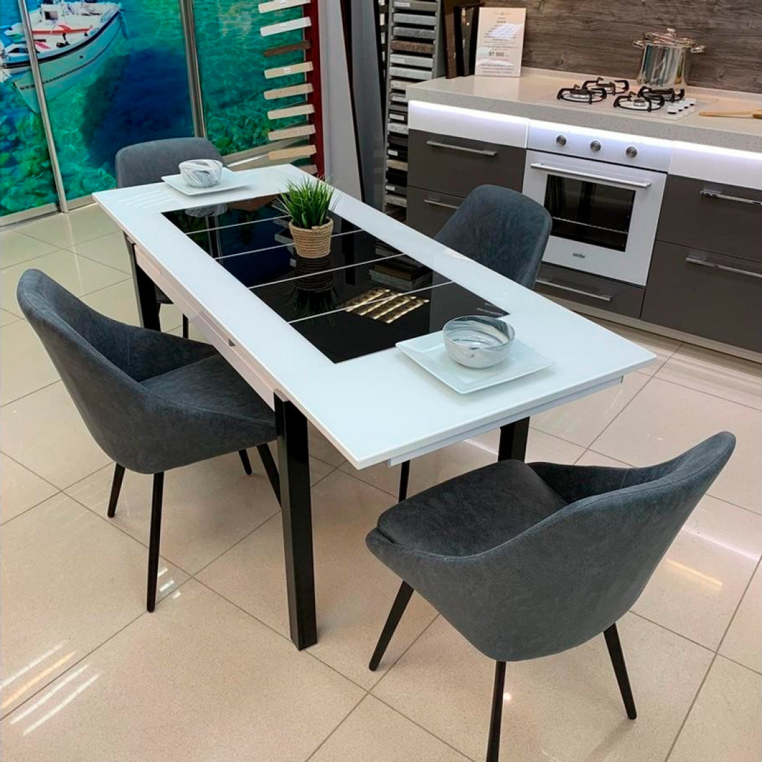 *На столах со стеклом допустим незначительный разнотон (разный оттенок) между вставкой (вставками) и половинками столешниц (столешницей).